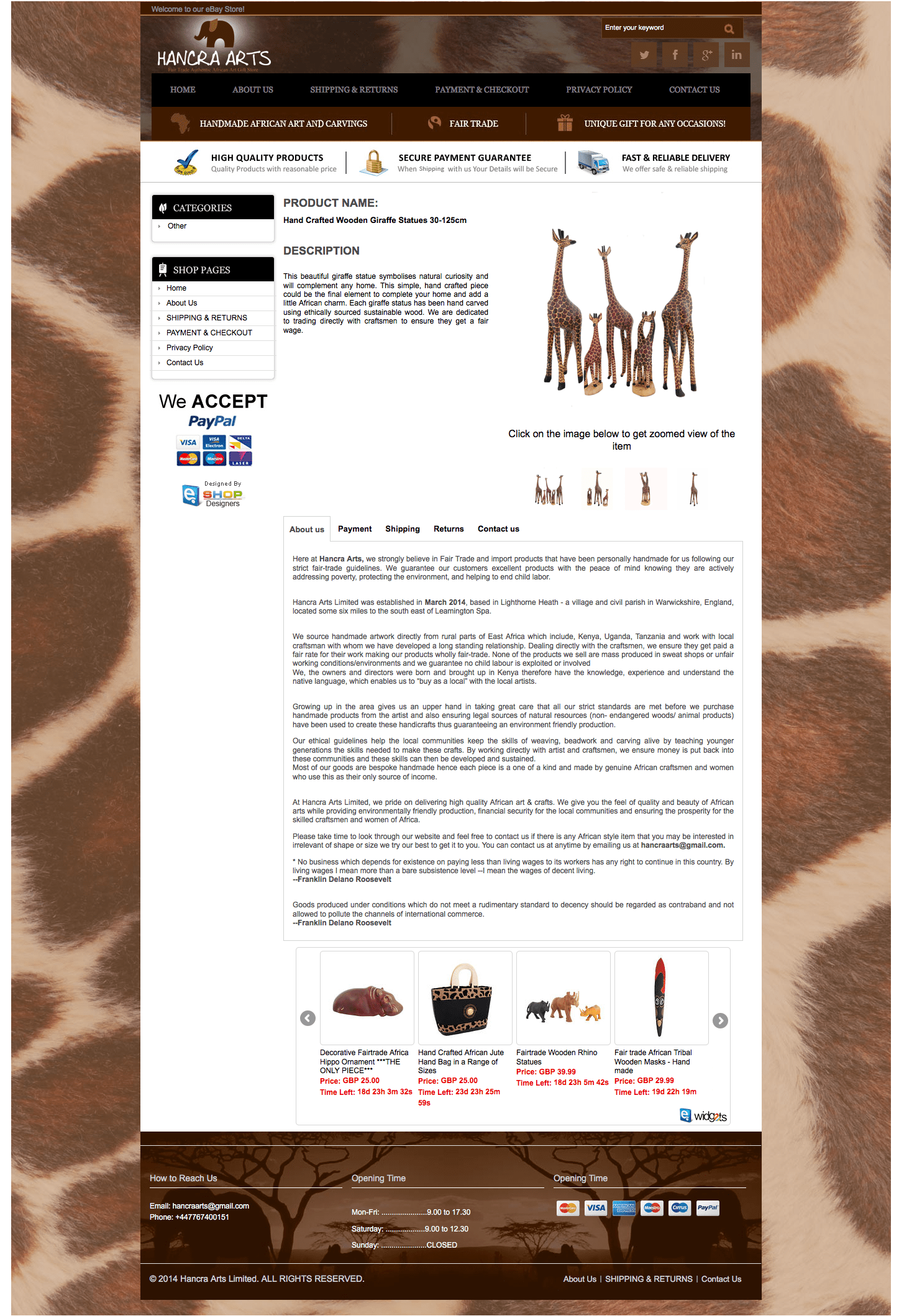 We source handmade artwork directly from rural parts of East Africa which include, Kenya, Uganda, Tanzania and work with local craftsman with whom we have developed a long standing relationship. Dealing directly with the craftsmen, we ensure they get paid a fair rate for their work making our products wholly fair-trade. None of the products we sell are mass produced in sweat shops or unfair working conditions/environments and we guarantee no child labour is exploited or involved