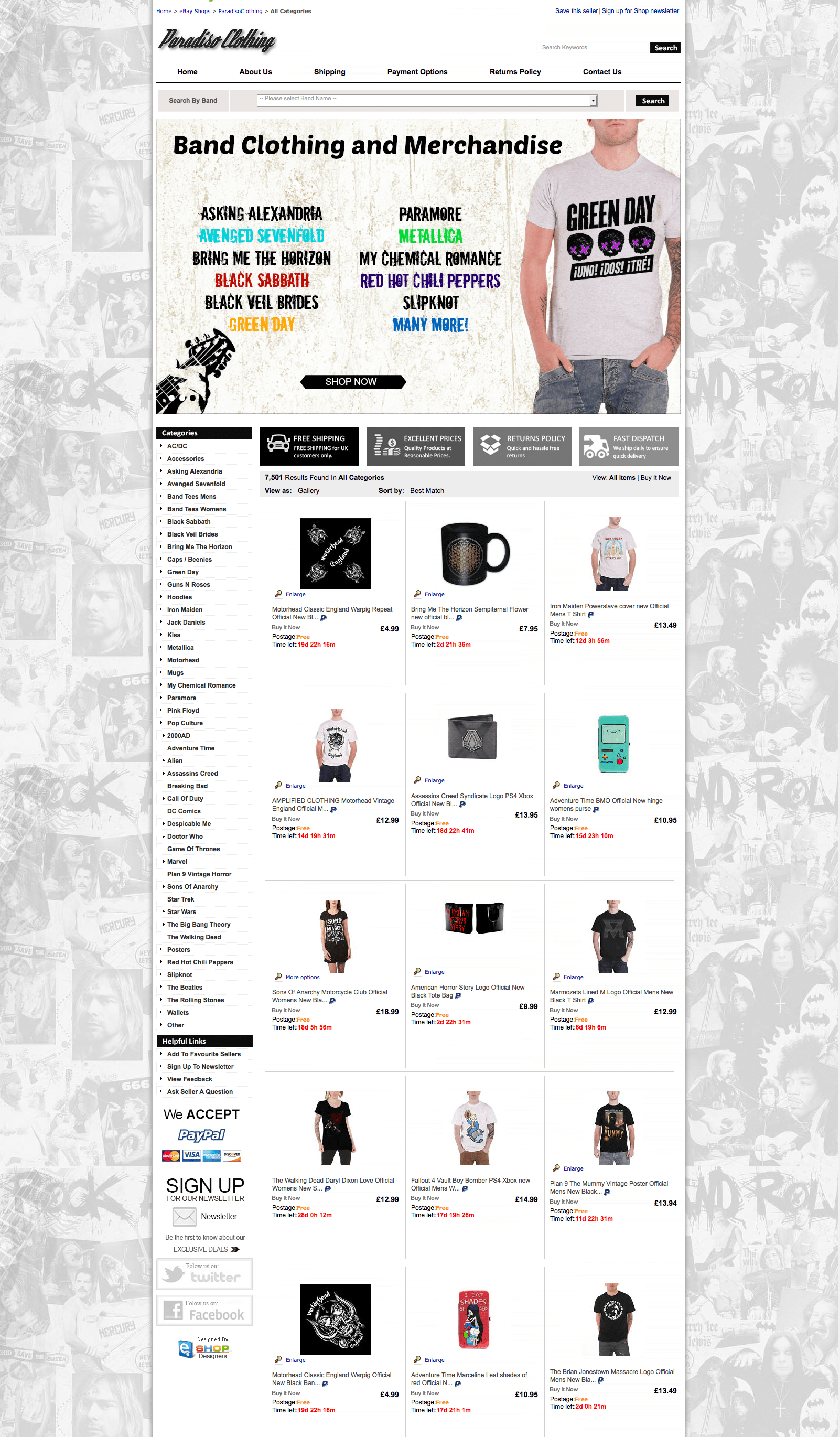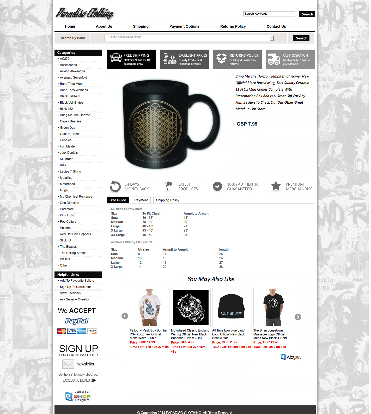 Paradiso Clothing is a family run business born out of a love of all things music , We Endeavour to offer the widest range of music merchandise covering all genera´s and styles.