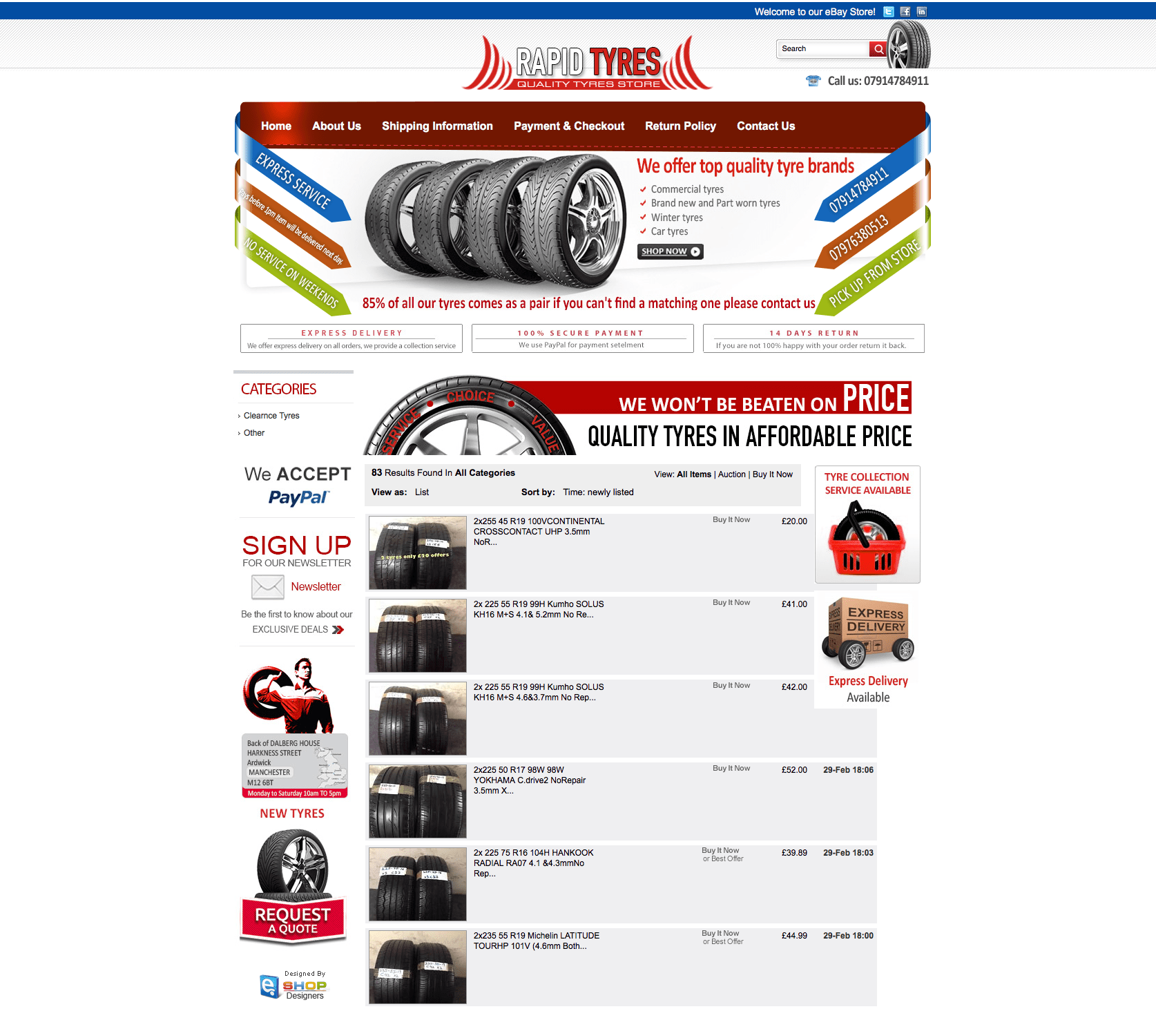 Rapid Tyres is a eBay shop created from scratch from our team. The store front account has a professional and clean look that every one loves.
