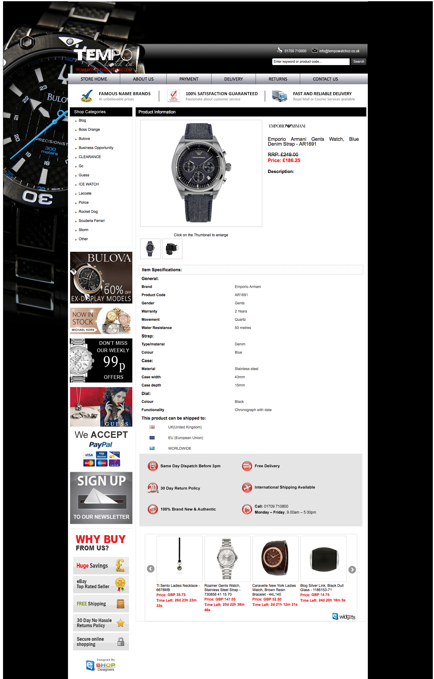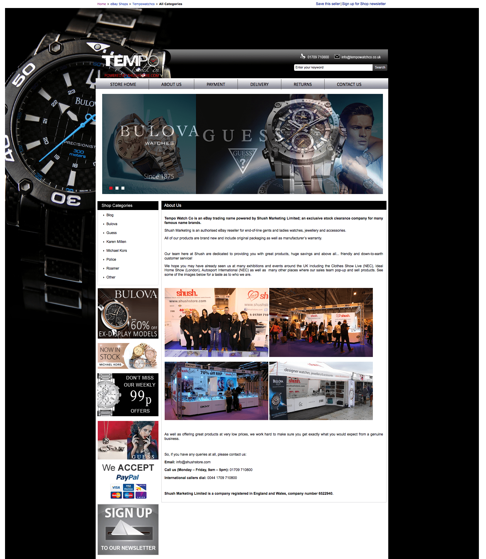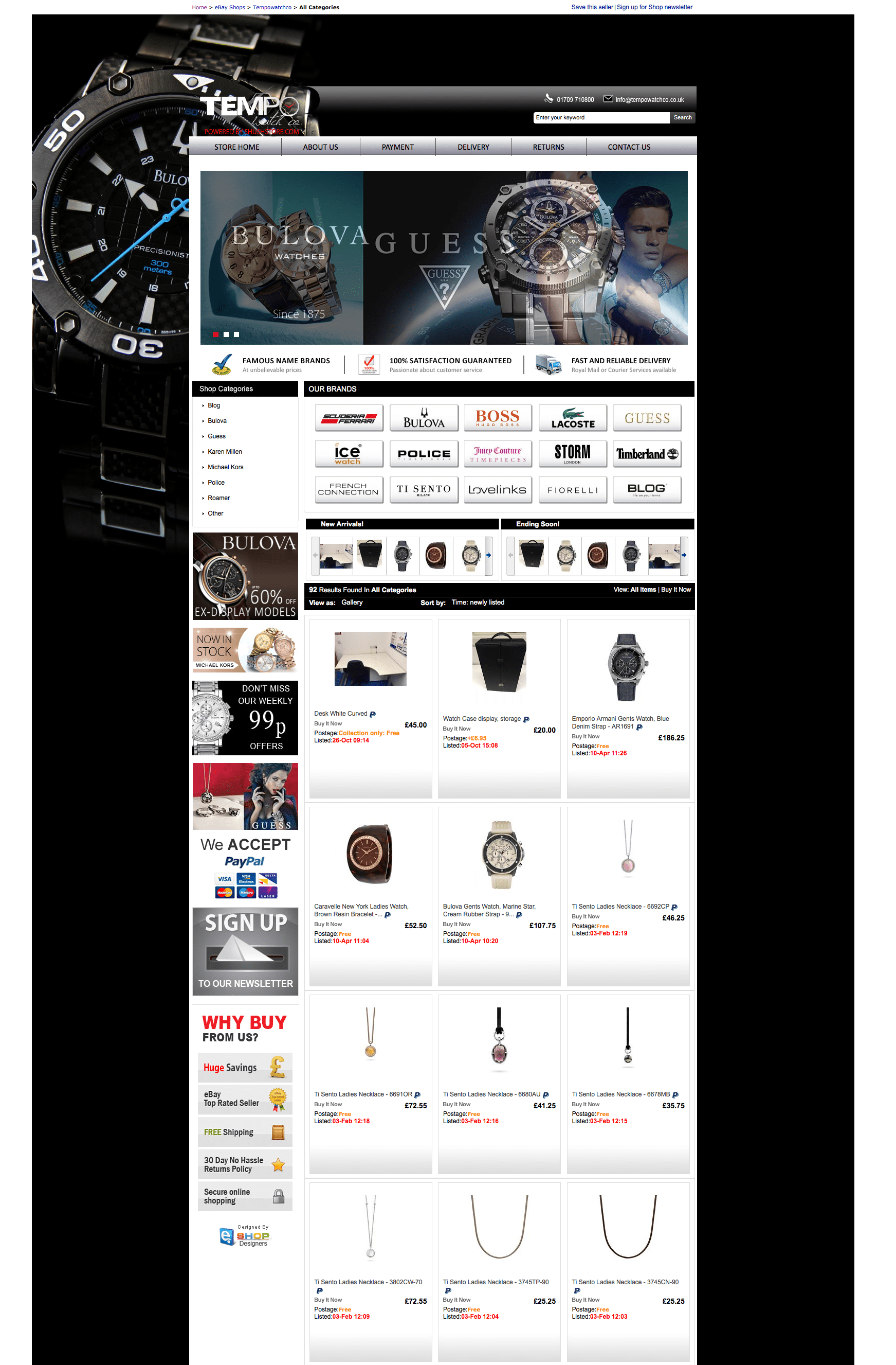 eShop Designers is pleased to help Tempo Watch to deliver a professional and fashion look to their eBay account. With the eBay store front, item listing template and custom pages, the branding and theme goes throughout the customers buying journey.