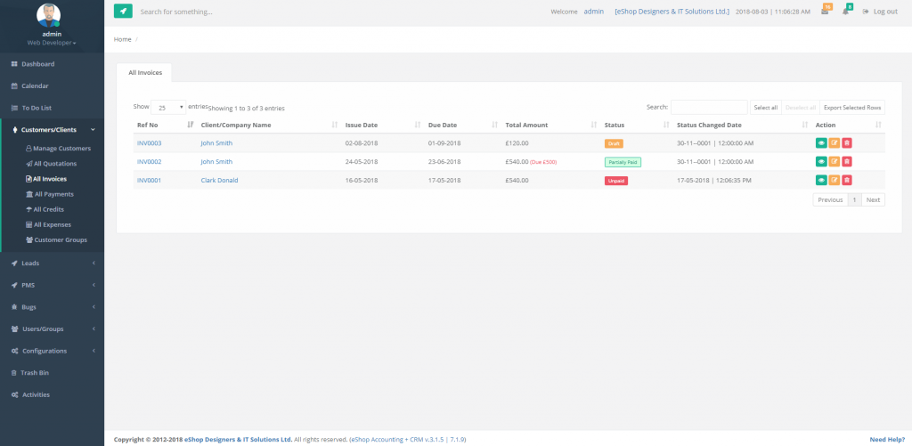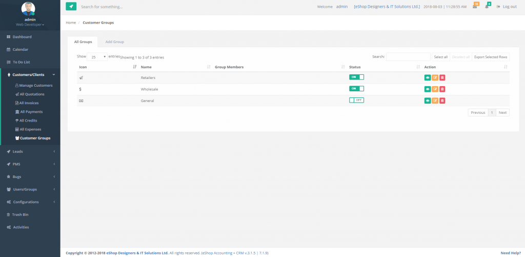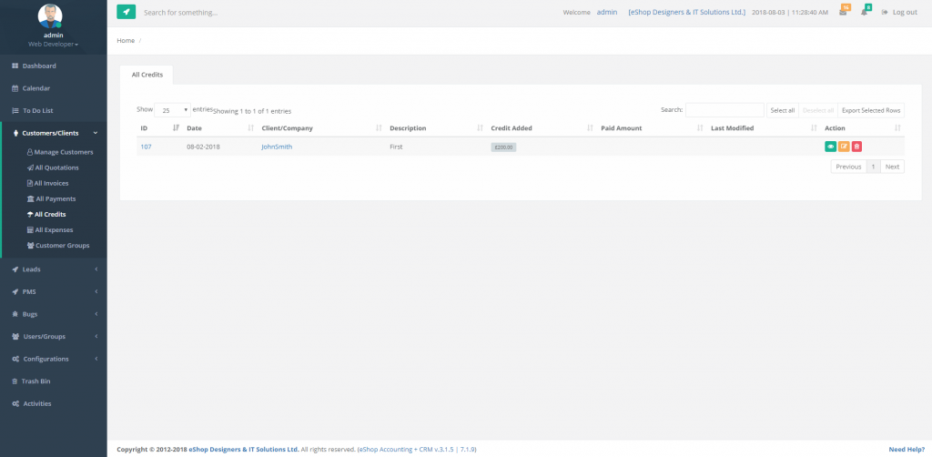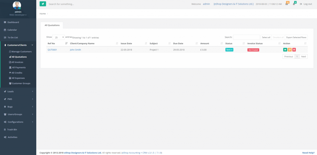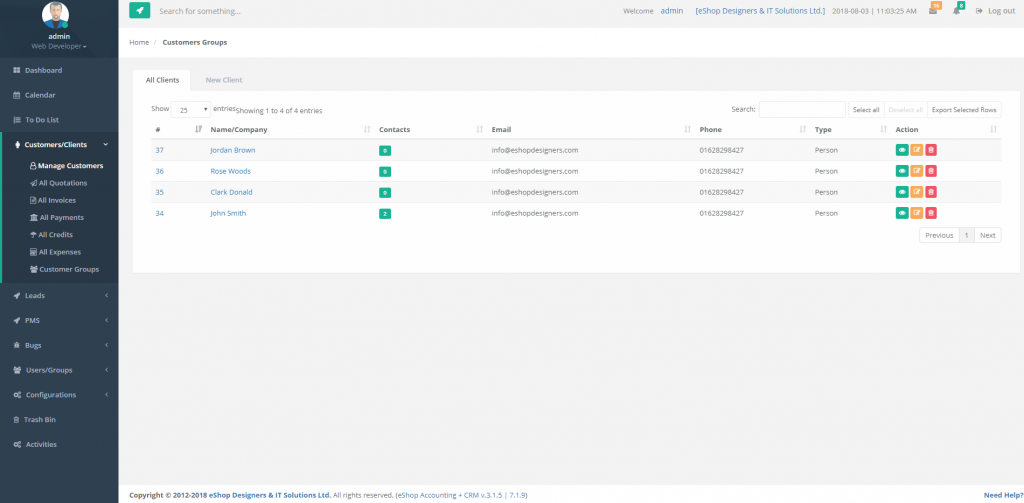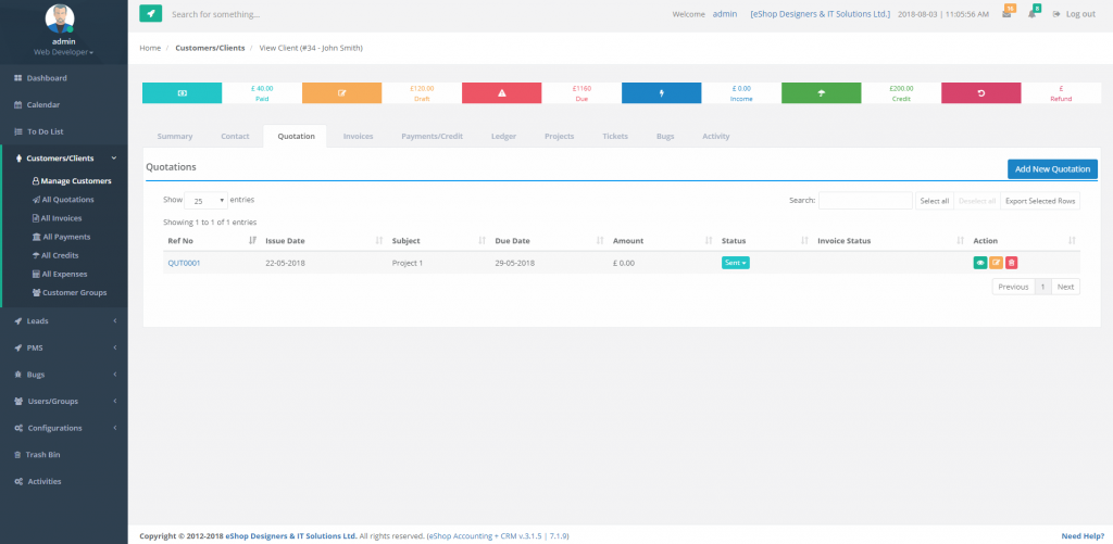 eShop DesignersCustomers and Clients- View and manage customers,  All quotations, All invoices, Payments, Credits, Expenses, Customer groups. You can also add contacts, view client activity and overview your clients account.
