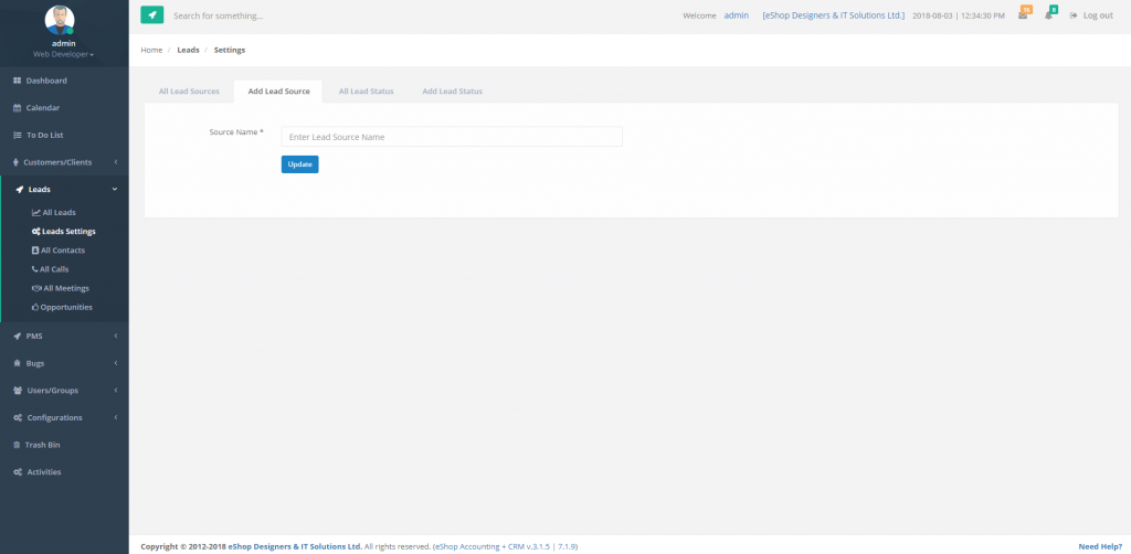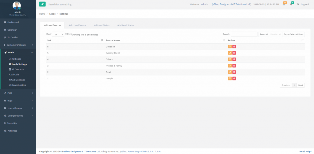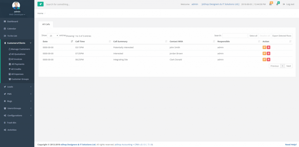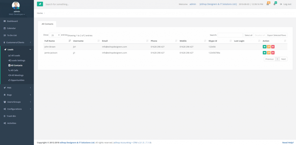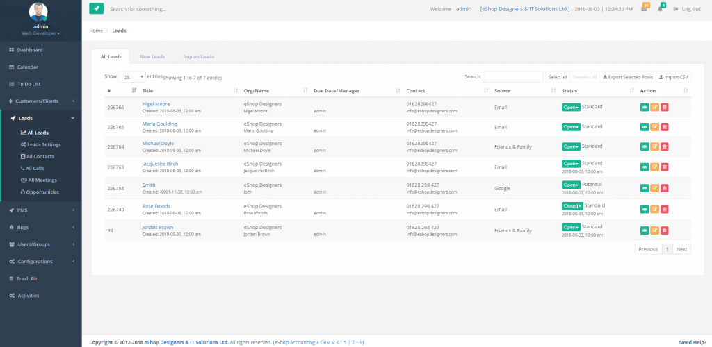 eShop DesignersLeads- View and manage leads, Leads settings, Contacts, Calls, Meetings, Opportunities. You can also add, edit and delete all, export and import, create calls, meetings and add comments.